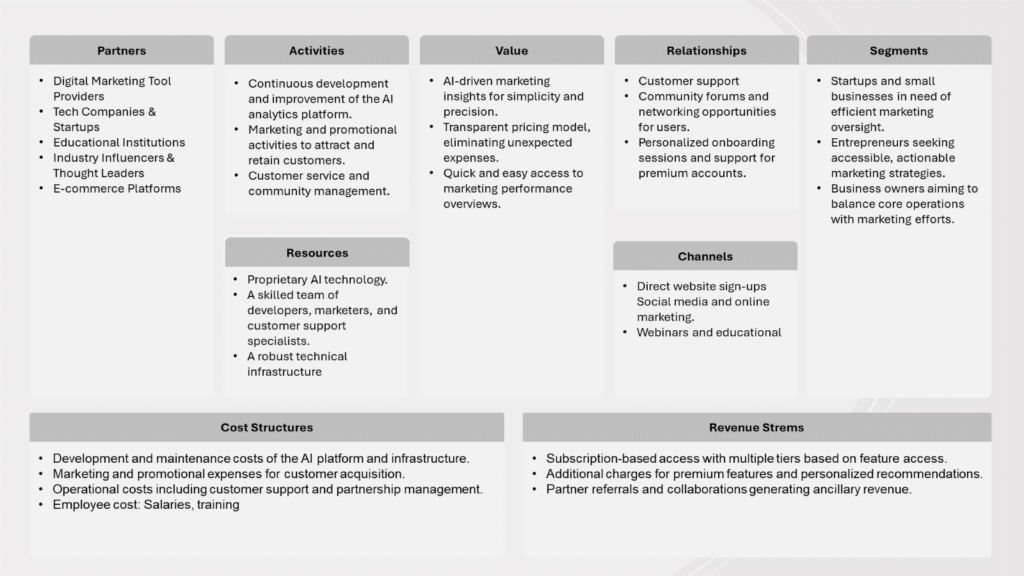 The Components of Verdandi’s Business Model Canvas (BMC) encapsulate the strategic details crucial for launching and maintaining Verdandi’s marketing platform. Designed specifically for startups and small businesses, Verdandi stands out through its simplified, AI-driven insights into marketing efforts. Let’s delve into the core components that define Verdandi’s business strategy: